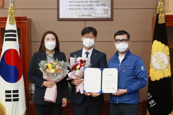 동희영 의회운영위원장의 추천으로 선정된 이상승 주무관은 주택정책과 주택정책팀 소속으로 오포와 광남동 일원 주택건설사업계획 승인 업무를 담당하며 빈틈없는 현장점검 및 철저한 안전교육을 통해 아파트 품질 향상에 기여했으며 특히 지역 업체와의 간담회와 지역 경제 챙기기 결의대회 개최 등 아파트 건설 현장에 지역 업체의 참여를 이끌어 지역 건설경기에 힘쓴 공을 인정받았다.
