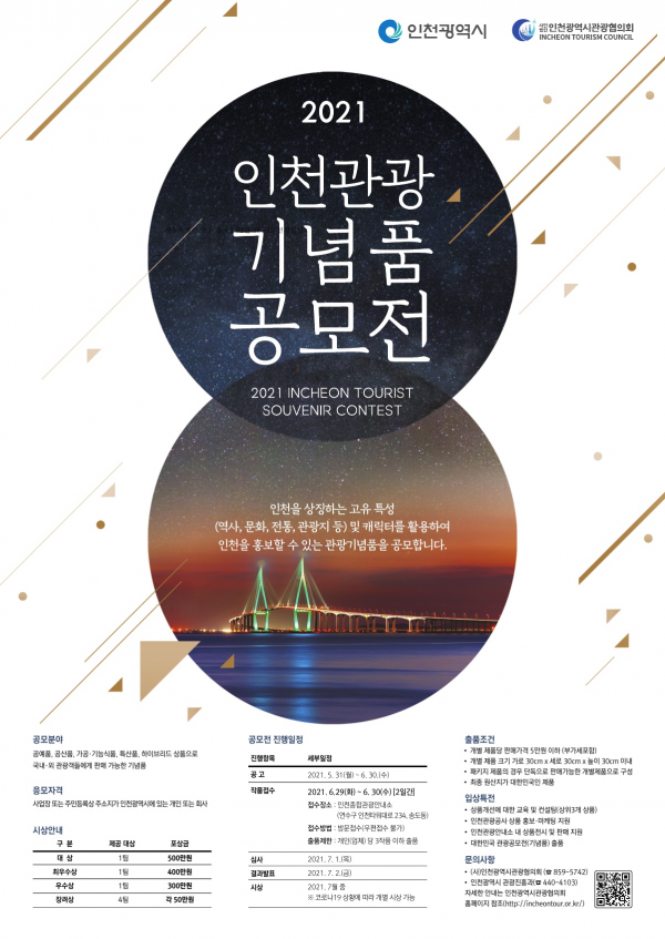 상위 3개 출품자에게는 상품개선을 위한 전문가 컨설팅이 제공되며 모든 입상작품의 판매 활성화를 위해 인천관광공사에서 홍보·마케팅을, 인천관광안내소에서 상품전시와 판매도 지원할 계획이라고 전했다.