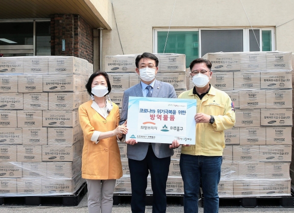 희망브리지 전국재해구호협회는 지난 9일 kf94마스크 20만장, 500ml 손소독제 2만점, 손소독티슈 9000점을 미추홀구와 동구에 나눠 전달했다.