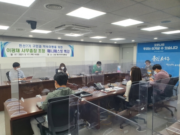 한국 매니페스토실천본부 이광재 사무총장이 강사로 나선 이번 특강에는 대면·비대면을 병행, 서구 공약사업 담당자 200여명이 참석했다.