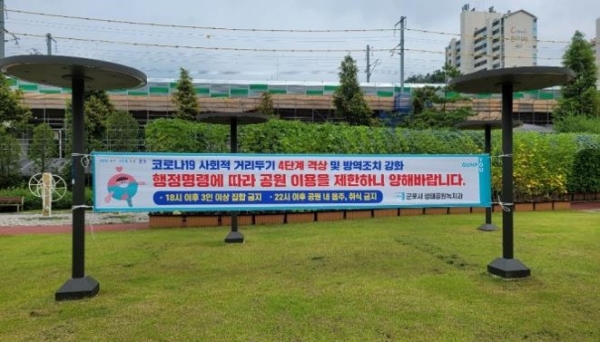 음주행위 금지는 4단계 거리두기가 해제될 때 까지 유지된다군포시는 공원 내 음주행위에 대한 지도와 단속도 시행하고 있으며 방역수칙 강화 현수막을 공원 곳곳에 부착하는 등, 시민 홍보활동도 병행하고 있다.
