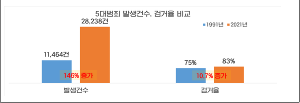 총 범죄 발생 건수는 55,916건에서 88,143건으로 약 1.5배가 증가하였는데, 그중에서도 5대범죄(살인·강도·강간·절도·폭력)는 11,464건에서 28,238건으로 2.5배가 증가하였다. 그럼에도 불구하고 5대범죄 검거율은 1991년 75%에서 2020년 83%로 상승하였다.