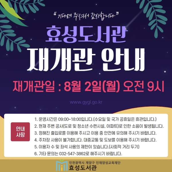 ▲ 효성도서관 자료실 리모델링 완료, 재개관 [경인신문] 인천광역시 계양구 구립 효성도서관은 지난 4월부터 실시한 도서관 자료실 확대 리모델링과 효성 제1구역 정비사업 관련 공사를 마치고 8월 2일부터 재개관한다. 리모델링 공사로 도서 열람공간과 서가를 확보해 도서관 이용의 편의성을 높였다. 도서관 관계자는 “아직 효성 제 1구역 정비사업이 진행되고 있어 주차장을 이용할 없고 소음이 발생하는 상황이지만 긴 임시휴관으로 발생하는 주민 불편을 해소하고자 최대한 빨리 재개관하게 되었으니 양해해 주시기 바란다”고 말했다.