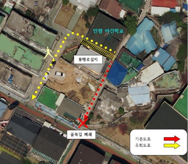 올해 3월 인근에 위치한 인향야간학교와의 협의를 통해 학교부지 일부인 인향야간학교와 골목길 사이의 담장을 털어내고 일부공간에 보행로를 조성해 다른 통행로와 연결하는 계획을 세웠다.