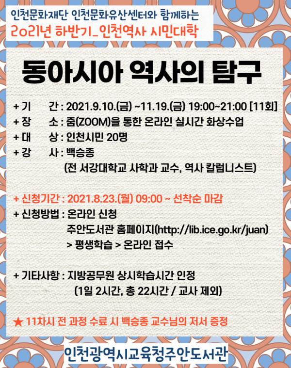 참가 대상은 관심 있는 인천시민 누구나 가능하며 강의는 줌을 통한 온라인 실시간 화상수업으로 진행한다.