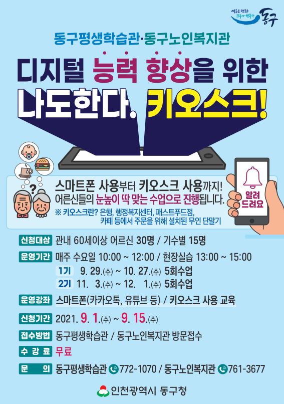 참여를 희망하는 구민은 9월 1일부터 15일까지 동구평생학습관, 동구노인복지관으로 방문접수 가능하며 수강료는 무료다.