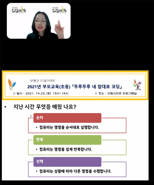 이번 부모교육은 인천광역시 북부교육지원청에서 연계해 김소영 코딩 전문 강사가 실시했으며 코로나19 상황을 고려해 줌 화상회의를 통해 온라인으로 진행했다.