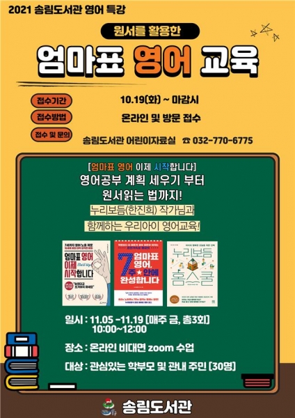 본 영어특강은 자녀들에게 영어교육의 지침이 될 수 있는 강좌로써 ‘엄마표 영어 이제 시작한다’의 저자 누리보듬 작가를 초청해 관내 주민 및 학부모 30명을 대상으로 오는 11월 5일부터 11월 19일까지 매주 금요일 오전 10시부터 2시간 동안 총 3회에 걸쳐 zoom을 통한 비대면 수업으로 진행할 예정이다.