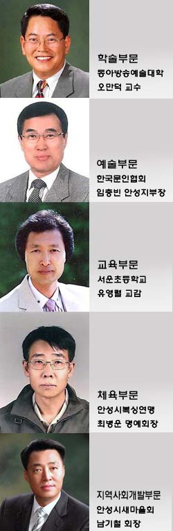 각 부문별 수상자는 동아방송예술대학 오만덕 교수(학술), 한국문인협회 임충빈 안성지부장(예술), 서운초등학교 유영렬 교감(교육), 안성시복싱연맹 최병운 명예회장(체육), 안성시새마을회 남기철 회장(지역사회개발) 등이다.