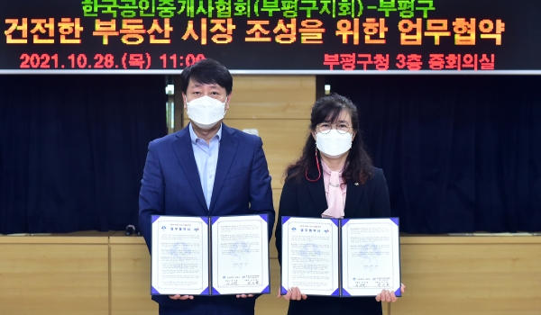 이날 협약에 따라 부평구는 제반 행정적 서비스를 제공하고 부평구지회는 불법 중개행위 근절 및 클린 부동산 캠페인에 적극적으로 협조하는 등 건전한 부동산 시장 조성을 위해 상호 협력하게 됐다.