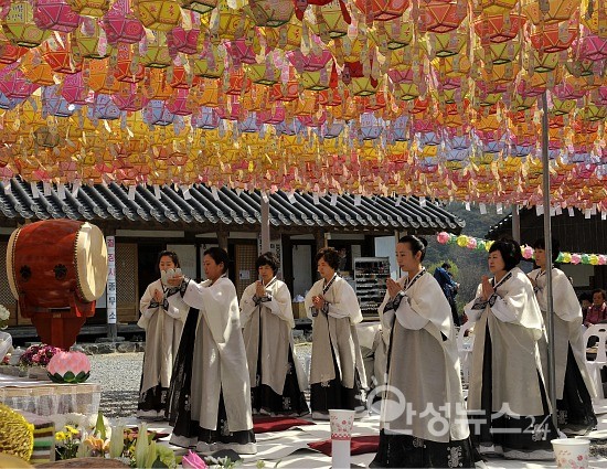 범종 타종식과 다례재에 앞서 열린 정통의식인 상단불공(上壇佛供)에서 명원 문화재단 안성시지부 문화학교(원장 이인자)는 육법공양(六法供養)과 함께 제를 올렸다.