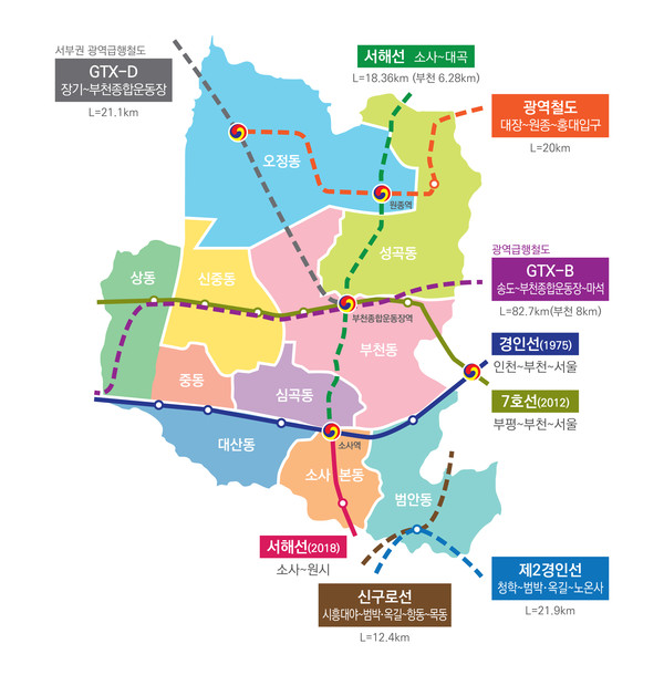 GTX-B 노선과 서부권광역급행철도(GTX-D)가 완성되면 소사-대곡선과 7호선을 잇는 쿼드러플 역세권이 될 종합운동장 일원 부지는 친환경 주거단지와 함께 융·복합 R&D시설, 복합문화·스포츠시설로 개발된다. 역곡 공공주택 사업은 풍부한 녹지축을 활용하여 스마트한 주거 단지로 조성되며, 오정 군부대 일원은 도시재생사업을 통해 신구도심간 균형발전을 도모한다.