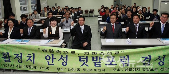 안성1동 주민자치센터에서 열린 결성식에는 한나라당 김학용 국회의원과 이철섭 안성시 부시장, 안성시의회 이동재 의장과 시의원, 민주당 윤종군 위원장과 유길상 안성시민장학회 이사장, 남기철 새마을지회 이사장 등 정당을 초월한 현 의원들과 정당인, 시민 등 100여명이 참여해 ‘안성 텃밭포럼’을 출범을 축하했다.