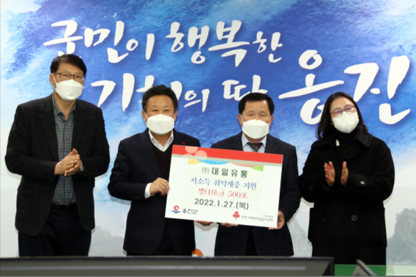 [경인신문= 이광일 기자]㈜ 대일유통 박경서(옹진수협 조합장)대표는 27일 옹진군에 지역의 어려운 이웃을 위한 10kg쌀 500포(10,000천원 상당)를 기탁했다.