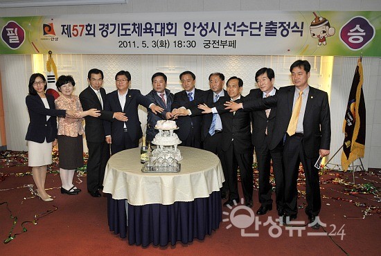 ▲시장, 시 의회 의원, 도의원및 체육관계자들이 필승을 다짐하며 케이크을 자르고 있다. 사진/박우열 기자 한편, 지난해 열렸던 56회 대회에서는 1위, 이천시(23,900점) 2위, 오산시(23,348점) 3위, 포천시(19,134점)에 이어 안성시는 11,765점으로 종합 9위를 차지한 바 있다.