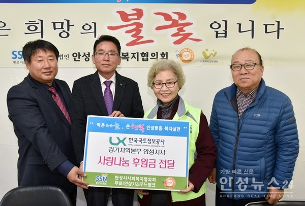 [뉴스24 = 강숙희 기자] 안성시사회복지협의회(회장 심숙희) 좋은이웃들은 22일, LX한국국토정보공사 안성지사(지사장 김용현)로부터 어려운 이웃을 돕기 위해 직원들이 십시일반 모금한 사랑나눔 후원금을 전달 받았다고 전했다.