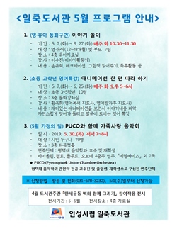 자세한 문의사항 및 신청은 5월 중 방문 또는 전화로 가능하며, 안성시립도서관 홈페이지(www.anseong.go.kr/library)에서도 자세한 안내를 받을 수 있다.