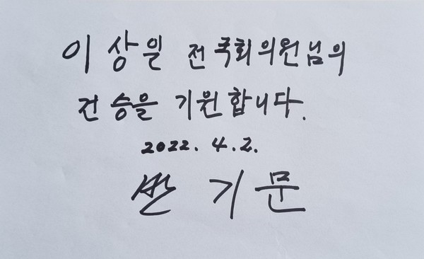 반 전 총장은 이날 이 전 의원과 만난 자리에서 A4 용지에 "이상일 전 국회의원님의 건승을 기원합니다"라는 글을 친필로 써서 이 전 의원에게 건넸다.