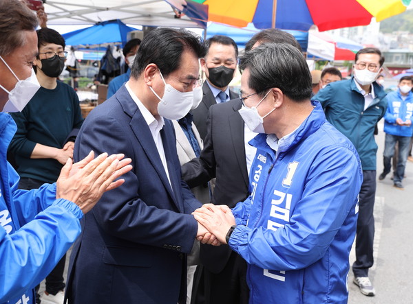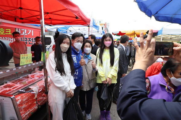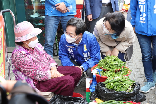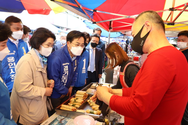 [경인신문=김신근 기자] 김동연 더불어민주당 경기도지사 예비후보가 25일 장날을 맞은 용인시 처인구 중앙시장을 찾았다.
