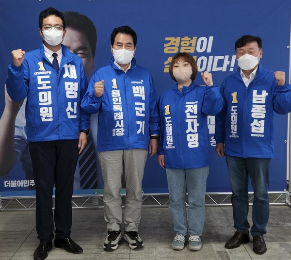 [경인신문=김신근 기자] 더불어민주당 용인시을지역 남종섭(제3선거구), 전자영(제4선거구), 채명신(제5선거구) 경기도의원 후보는 3일 백군기 용인특례시장 후보와 필승 의지를 다지며 ‘용인원벤져스’ 첫 행보에 나섰다.