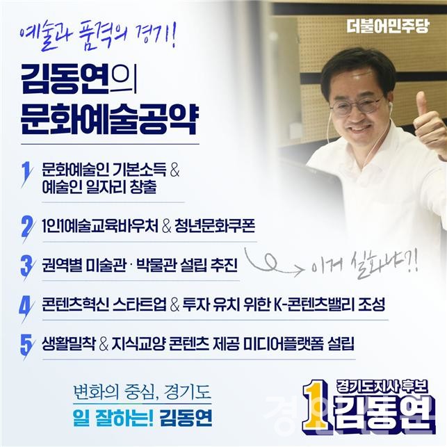 [경인신문=김신근 기자] 김동연 더불어민주당 경기도지사 후보는 12일 페이스북 메시지를 통해 ‘문화예술 6대 공약’을 발표했다. 코로나 팬데믹으로 큰 타격을 입은 문화예술인들에 대한 지원을 포함하여, 경기도민이 풍요로운 문화생활을 누릴 수 있는 환경을 조성하기 위한 구체적 계획이 담겼다.