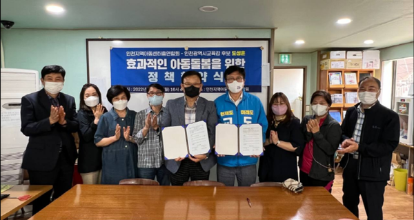 [ 경인신문= 이광일 기자] 인천시교육감 도성훈 후보는 지난 16일 인천지역아동센터연합회(회장 김신)와 연합회 사무실에서 효과적인 아동 돌봄을 위한 정책 협약식을 체결했다.