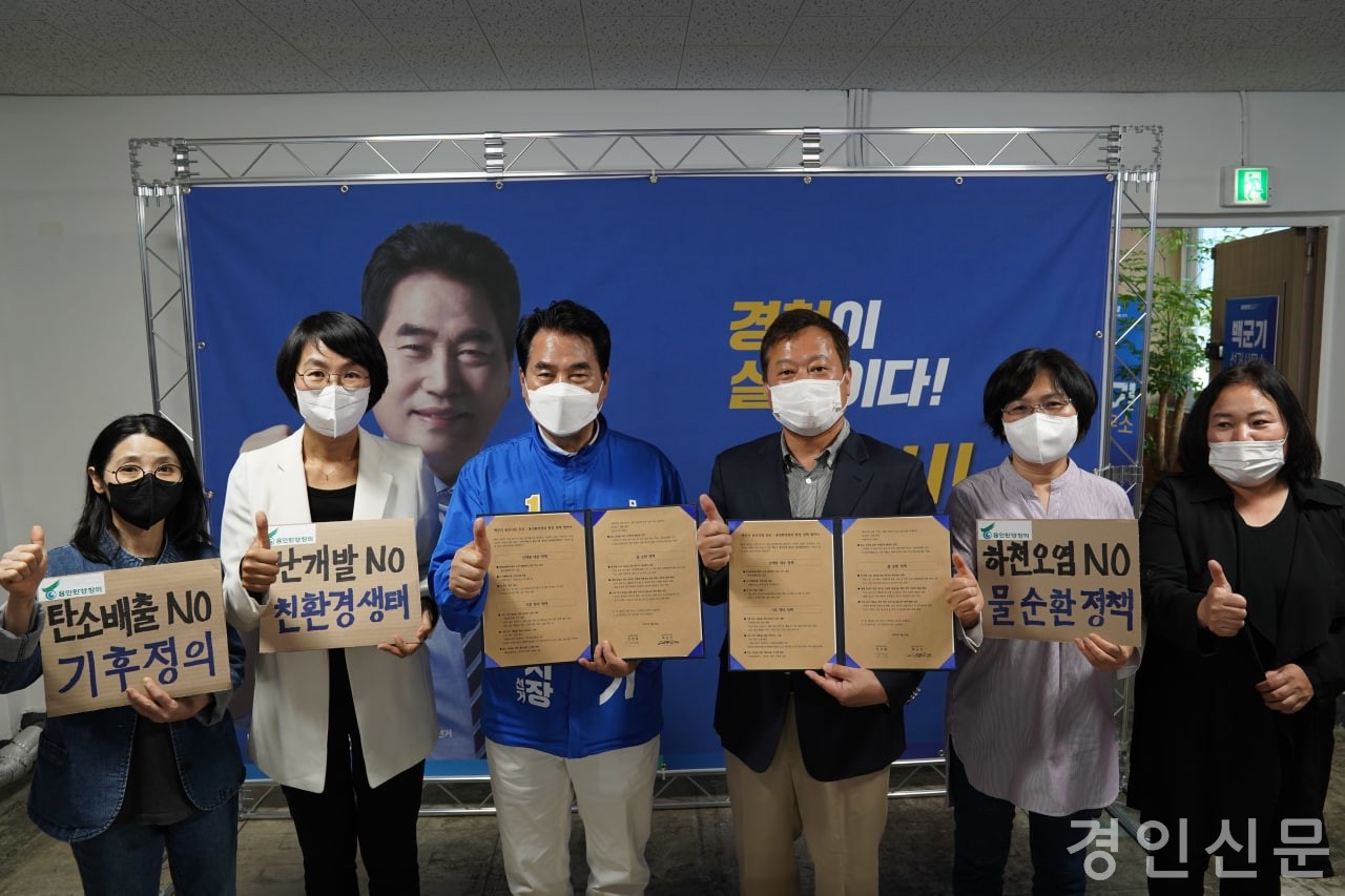 [경인신문=김신근 기자] 더불어민주당 백군기 용인특례시장 후보와 용인환경정의는 오늘(20일) 기흥구 신갈오거리 선거사무소에서 환경정책 협약을 체결하였다.