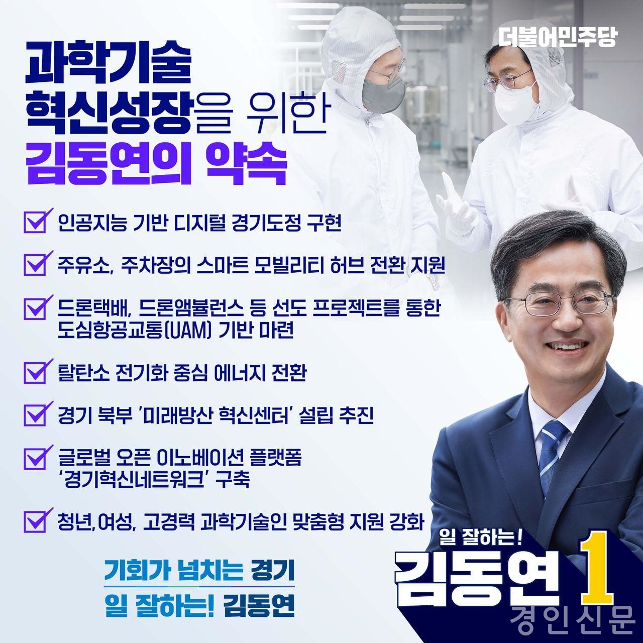 김동연 후보는 지난 19일 페이스북 메시지를 통해 “인류의 진보는 과학기술 발전의 역사와 궤를 함께 해왔다”라며 ▲도민이 체감하는 디지털 전환 ▲선도적 모빌리티 전환을 통한 미래 모빌리티 산업 기반 마련 ▲탈탄소 전기화 중심의 에너지 전환 ▲미래산업 육성을 위한 과학기술 R&D와 인프라 투자 등의 4대 공약을 발표했다.