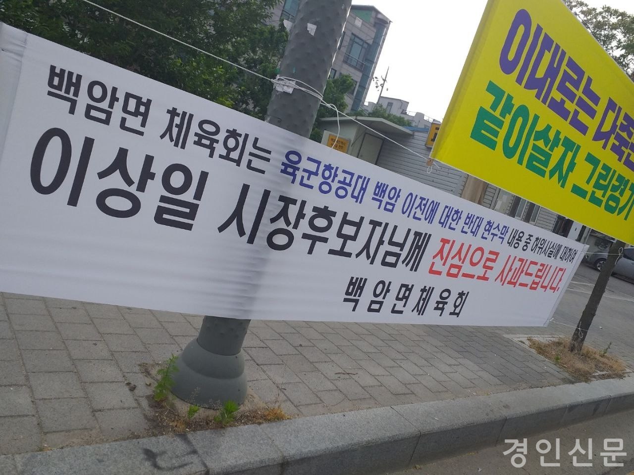 4년 전 지방선거 때 포곡 육군항공대 임기내 이전을 공약한 더불어민주당 백군기 후보는 약속을 지키지 못했다는 비판을 의식한 듯 이번에도 육군항공대 이전 추진을 공약으로 내세우고 거리에 현수막을 걸었다.