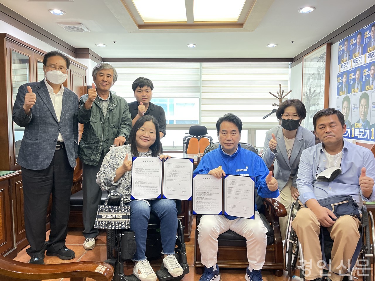 [경인신문=김신근 기자] 더불어민주당 백군기 용인특례시장 후보와 용인장애인시민파워는 오늘(21일) 수지구 백군기후보 연락사무소에서 장애인정책 협약을 체결했다.