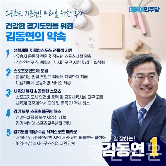 김동연 후보는 21일 페이스북 메시지를 통해, 스포츠에 대한 애정을 드러내면서 경기도를 스포츠 복지의 모델 도시, 생활체육의 천국으로 만들겠다는 포부를 밝혔다.