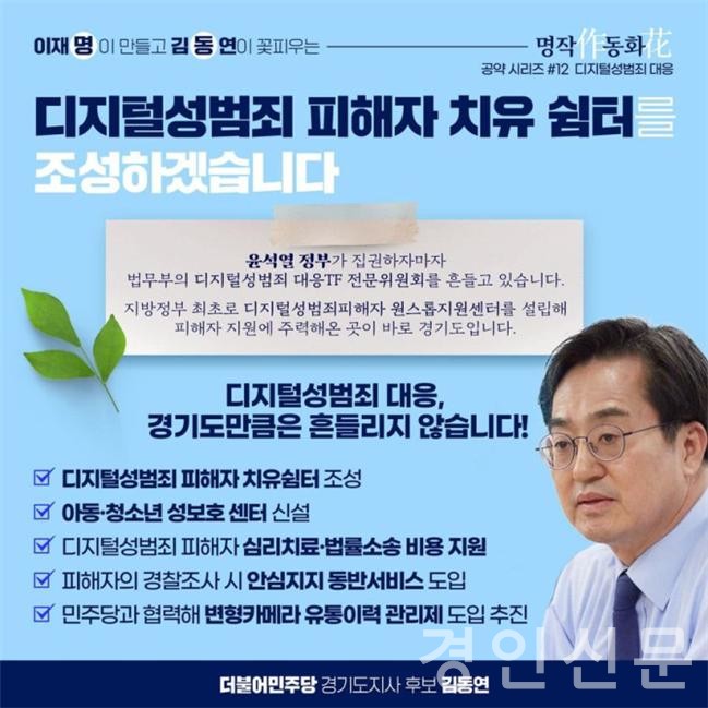 김동연 후보는 “경기도만큼은 절대 후퇴하지 않겠다”고 밝힌 뒤, “이재명 전 지사가 마련한 토대 위에서 디지털성범죄 피해자 보호를 강화하겠다”며 공약 이행 의지를 강조했다.