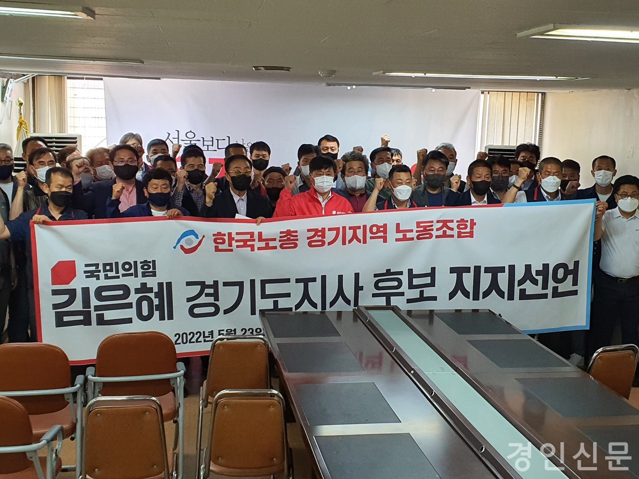 한국노총 경기지역 노동조합은 23일 국민의힘 경기도당사에서 노동이 존중받는 경기도를 만들어 줄 김은혜 후보를 지지한다고 밝혔다.