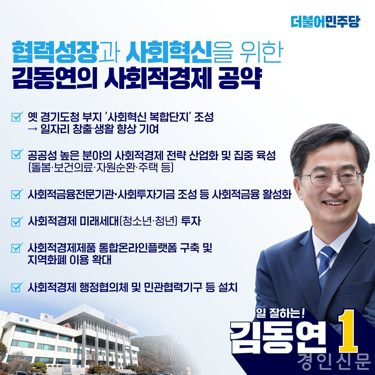 [경인신문=김신근 기자] 김동연 더불어민주당 경기도지사 후보가 ‘사회적경제 5대 정책 공약’을 발표했다. 사회적경제 활성화를 통해 경기도 내 선순환 경제 체제를 강화하고, 경기도의 협력성장과 사회 혁신을 이뤄 내겠다는 포부다.