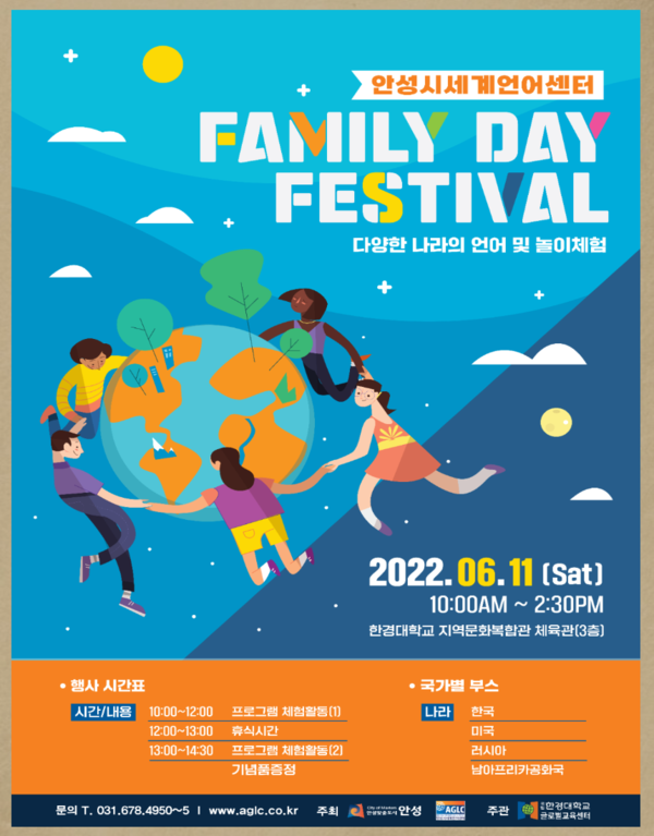 [경인신문 = 강숙희 기자] 안성시 세계언어센터(센터장 강기용)에서는 오는 6월 11일 한경대학교 지역문화복합관에서 관내 거주 내‧외국인 간의 문화적 소통과 교류의 장을 마련하고자 ‘제1회 AGLC 패밀리데이 축제’를 개최한다고 밝혔다.