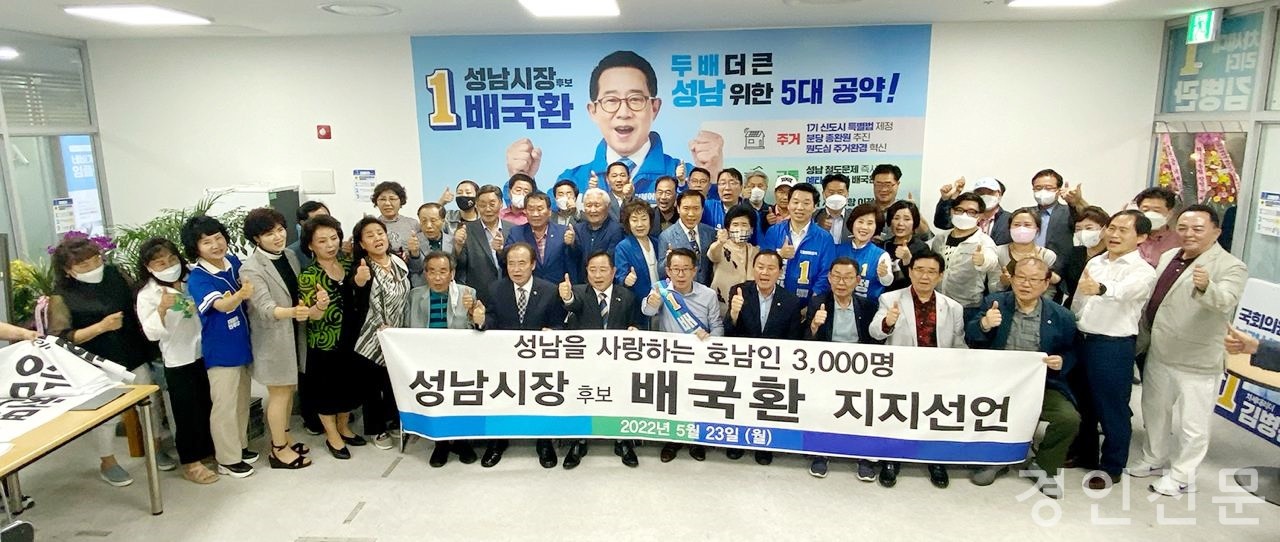 [경인신문=김중택 기자] 더불어민주당 성남시장 후보인 배국환 후보 선대본부인 <따뜻한 캠프> 최현 전략기획실장은 어제(23일) 성남을 사랑하는 호남인 3천인과 퇴임 공직자 가족 71인이 배국환 후보 지지선언을 했다고 밝혔다.