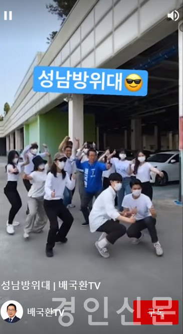 출마 직후 유튜브와 인스타그램을 시작한 배국환 후보 선대위는 상대적으로 성남 정가의 신인인 배국환 후보의 인지도 상승을 위한 다양한 홍보 방법을 시도해왔다. 그 중 가장 좋은 반응을 얻고 있는 영상은 페이스북과 틱톡 이용자들 사이에 화제가 되었던 ‘지구방위대 챌린지’에서 영감을 얻은‘성남방위대’영상이다.
