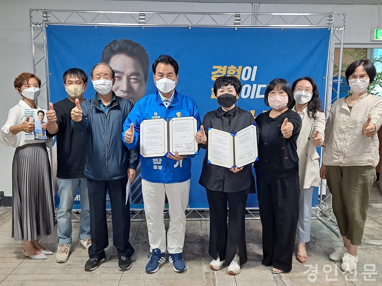 [경인신문=김신근 기자] 식생활교육용인네트워크(대표 박영순)는 오늘(24일) 기흥구 신갈오거리 선거사무소에서 백군기 후보와 ‘시민에게 건강한 먹거리 제공과 농민의 소득증대를 위한 지속가능한 먹거리·농업 환경 조성“을 위한 정책협약을 가졌다.