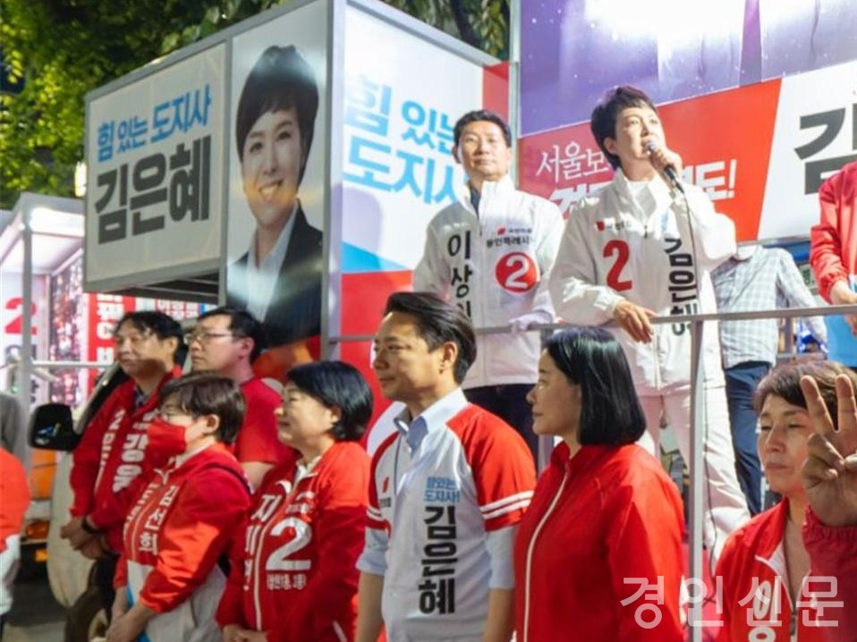 [경인신문=김신근 기자] 김은혜 국민의힘 경기도지사 후보와 이상일 용인시장 후보가 24일 저녁 용인시 수지구청 사거리에서 합동 유세를 펼쳤다.