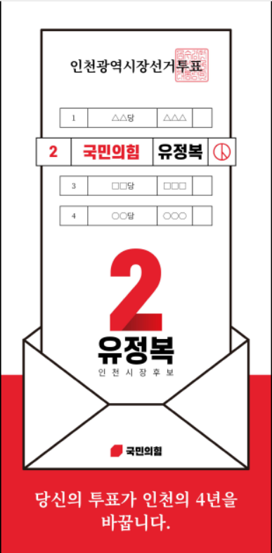 ‘인천발전의 적임자 유정복에게 2번에는 사전투표!’와 ‘당신의 투표가 인천의 4년을 바꿉니다!’란 문구의 카드뉴스를 문자메시지나 카톡 등을 통해 대대적으로 뿌리고 있다.