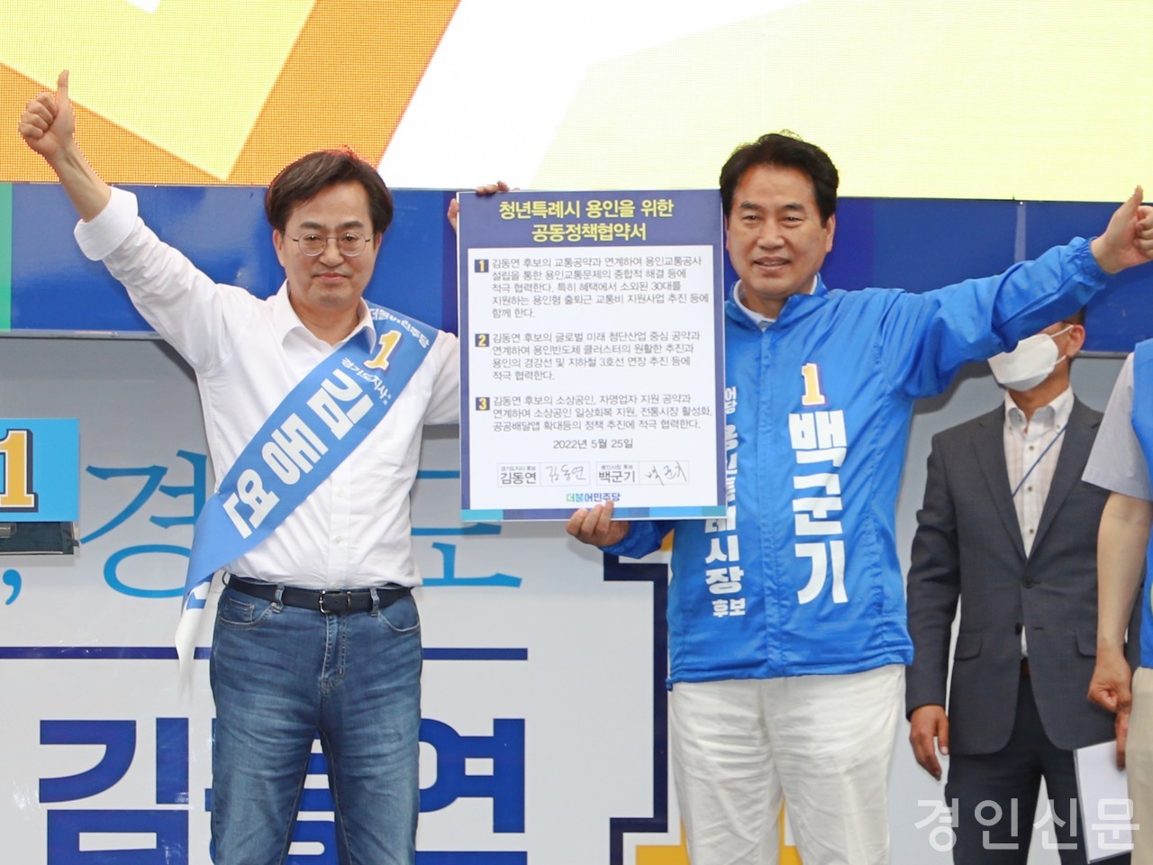 [경인신문=최철호 기자] 백군기 더불어민주당 용인특례시장 후보와 김동연 경기도지사 후보는 오늘(25일) 용인 처인구 중앙시장 공동유세에 앞서 ‘청년특례시 용인을 위한 공동정책협약’을 맺었다.