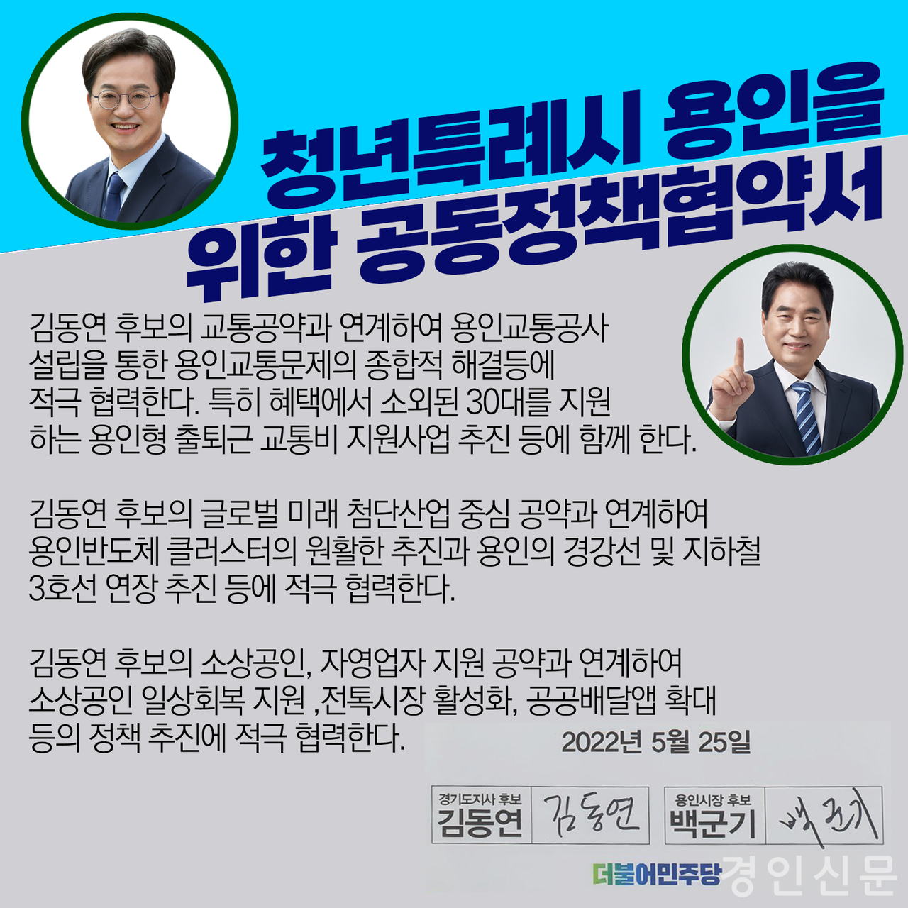 협약은 김동연 후보의 교통공약과 연계하여 용인교통공사 설립을 통한 용인교통문제 종합적 해결에 공동 노력하기로 했다.또한 30대 직장인을 위해 대중교통비를 지원하는 용인형 출퇴근 교통비 지원사업에도 적극 협력하기로 했다.
