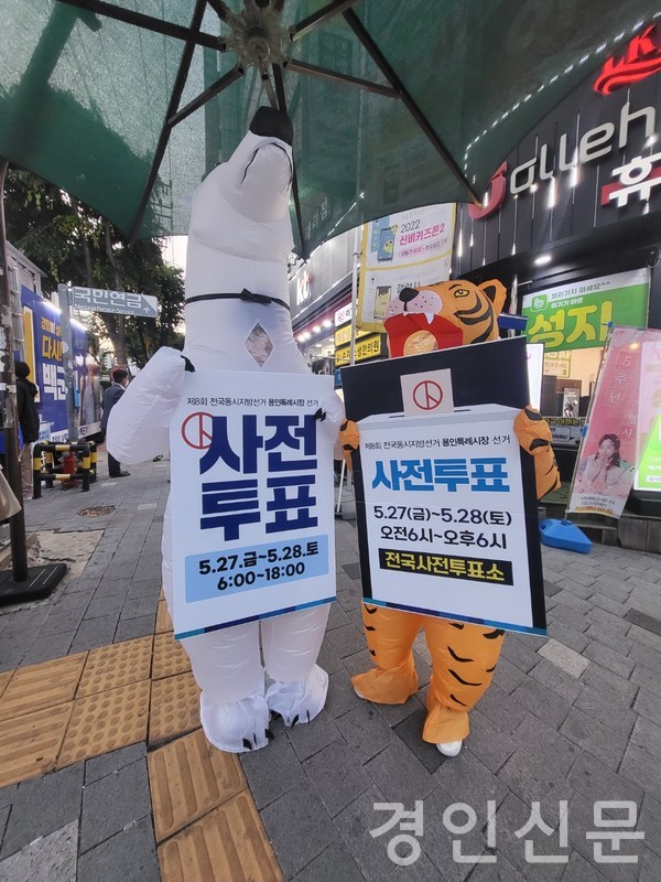 공룡·북극곰·호랑이 인형을 입고 유세에 나선 동물유세단은 오늘 수지구청 사거리 유세를 시작으로 사전투표 기간 동안 용인 곳곳을 돌며 시민들을 대상으로 사전투표 독려에 나선다.