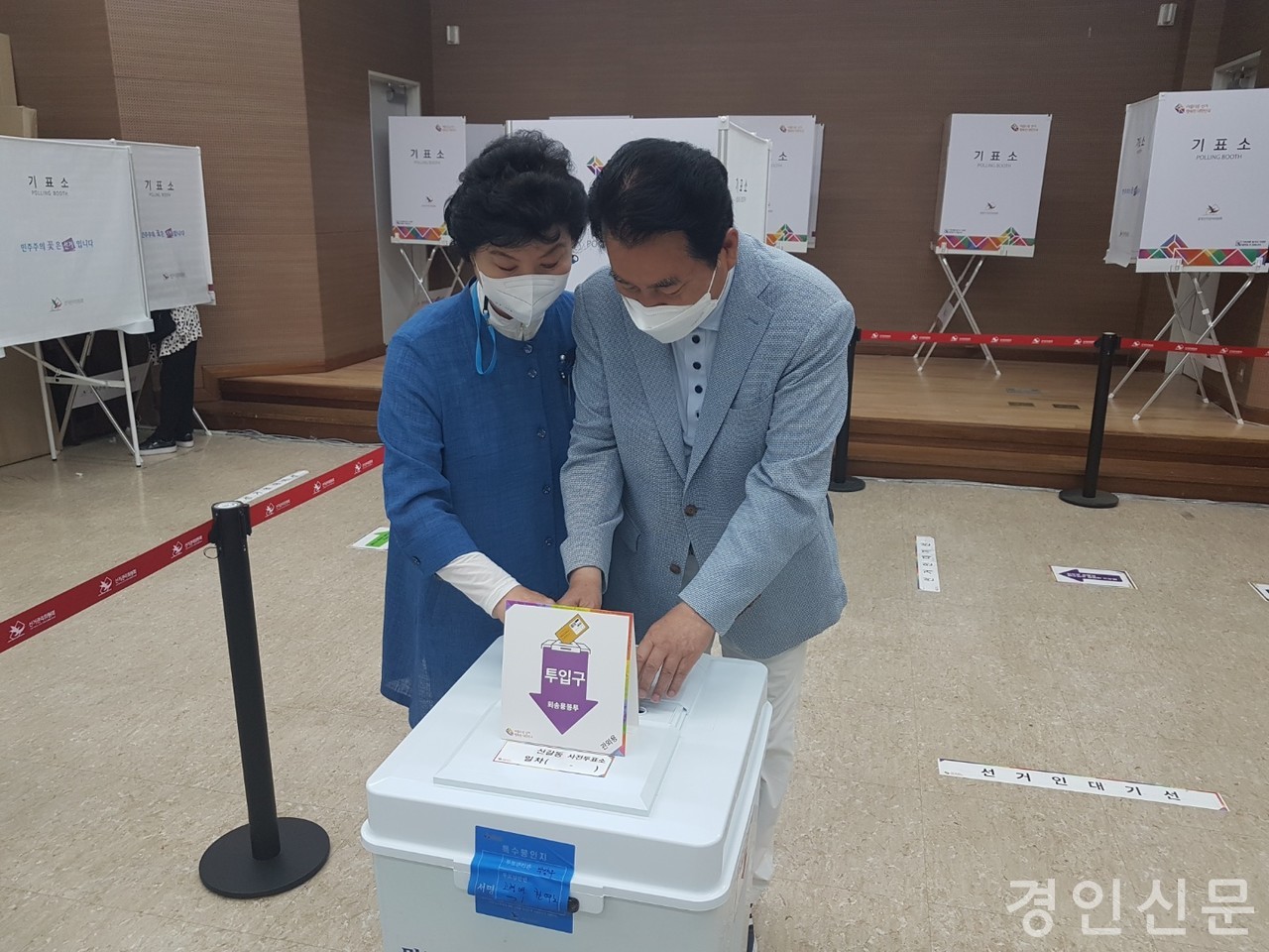[경인신문=김신근 기자] 더불어민주당 백군기 후보와 부인 손숙자씨는 사전투표 첫날인 오늘(27일) 오전 7시 기흥구 신갈동 행정복지센터에서 소중한 한표를 행사하였다.
