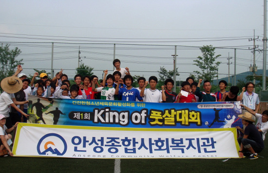 안성종합사회복지관(김활란 관장)에서는 지난 2010년 7월 29일(목) 동광아파트 앞 체육공원(풋살경기장)에서 제1회 King of 풋살대회를 개최했다. 이 대회는 청소년들의 건강한 체육문화를 증진시키고 지역주민들의 체육활동을 활성화시키기 위한 것으로, 이 날 대회에 초등부 5팀, 중등부 5팀, 고등부 7팀이 참가해 박진감 넘치는 경기를 펼쳤다.