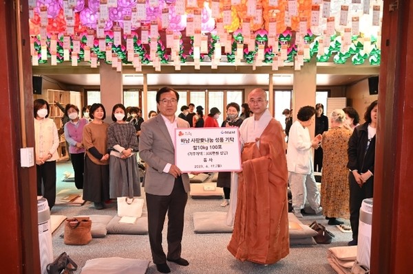 [ 경인신문= 김민석 기자] 대한불교조계종 동사는 지난 17일 하남 사랑愛나눔 성품으로 쌀10kg 100포 (기부가액 300만원 상당)를 하남시에 전달하고 기탁식을 가졌다.