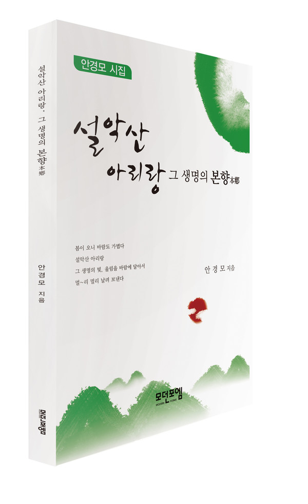 [경인신문=최철호 기자]양양 출신 안경모 경희대 관광대학원 교수(시인)가 ‘설악산 아리랑-그 생명의 본향(本鄕)’ 시집(모던포엠 : 발행인 전형철)을 상재했다. 이번 시집은 30편의 시작(詩作)과 시편마다 엄창섭 시인(카톨릭관동대 명예교수)의 감상평이 실려서 독자의 이해를 높이는 소통의 의미도 담고 있어서 더욱 눈길을 끈다.