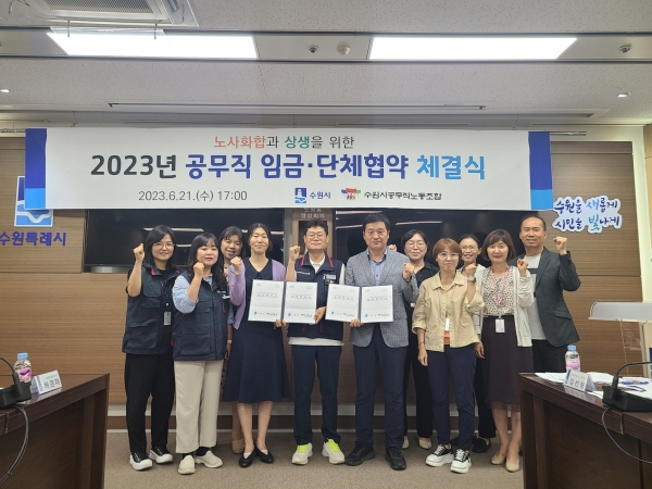 김규동 수원시공무직노동조합 위원장은 “조합원의 근로 조건 개선을 위해 노력해 준 수원시에 감사드린다”며 “앞으로도 적극적인 소통으로 노사협력이 강화되도록 하겠다”고 말했다.