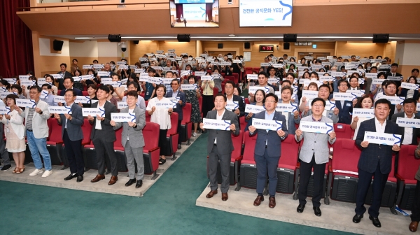 이재준 수원특례시장, 김현수 제1부시장, 황인국 제2부시장을 비롯한 모든 수원시 공직자는 “직장 내 성희롱 NO, 건전한 공직문화 YES”라느 구호를 외치며 “안전하고 성평등한 직장생활을 위해 상대방을 배려·존중하고 성희롱 없는 밝고 건전한 직장 분위기를 조성하겠다”고 결의했다.