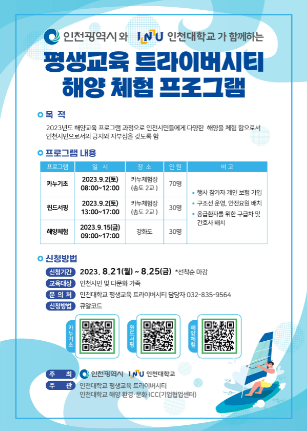 프로그램별 인원은 인천대학교 홈페이지(https://citizens.inu.ac.kr)를 통해 카누기초(70명), 윈드서핑(30명), 해양환경(30명) 등 8월 21일부터 25일까지 총 130명을 선착순으로 모집한다.